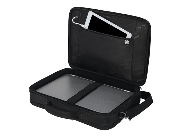 Le compartiment principal refermable à clapet protège votre ordinateur portable de 14 à 15,6" avec un rembourrage complet en mousse haute densité (HDF) et Nylex souple, à un cadre renforcé de métal et à une fixation fiable avec une sangle. Votre tablette jusqu'à 10,5" est également casée en toute sécurité dans sa poche spéciale rembourrée. La poche avant spacieuse permet de mettre de l'ordre avec son compartimentage fonctionnel pour smartphone, batterie externe, stylos et autres accessoires. Un compartiment supplémentaire zippé sur la partie inférieure avant du sac permet de ranger le chargeur et les câbles. La poignée de forme ergonomique et rivetée, une sangle avec renfort rembourré aux épaules réglable en longueur ainsi que la lanière de fixation trolley au dos permettent une utilisation flexible et garantissent un transport confortable.
