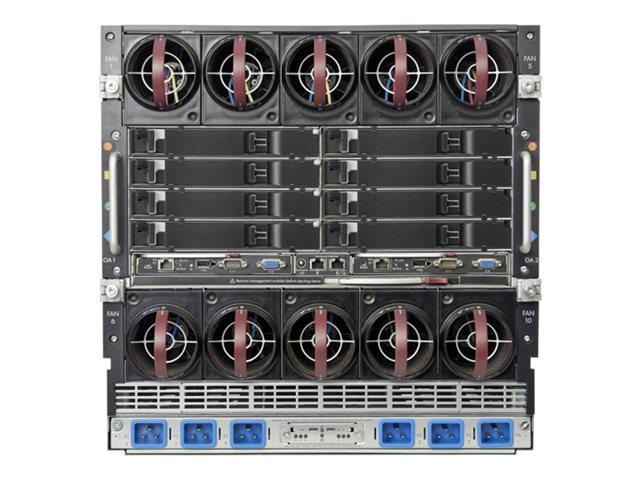 Le boîtier BladeSystem c7000 fournit toutes les infrastructures d'E/S et les systèmes de refroidissement et d'alimentation nécessaires pour prendre en charge le serveur modulaire, l'interconnexion et les composants de stockage actuels et futurs. Le boîtier a une hauteur de 10 U et peut contenir jusqu'à 16 lames de serveur et/ou de stockage en plus de modules réseau et d'interconnexion de stockage redondants facultatifs. Il comprend un fond de panier NonStop hautes performances partagé de 7,1 Tb/s pour une connexion des lames de serveurs au réseau et au système de stockage partagé câblée en une seule fois. L'alimentation est assurée par un fond de panier à alimentation groupée. La flexibilité de l'alimentation est assurée grâce aux différentes méthodes d'entrée d'alimentation suivantes : entrée CA monophasée, entrée CA triphasée, entrée CC de 48 V et entrée CC à haute tension.