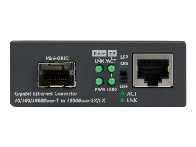 Ce convertisseur de média fibre optique constitue un moyen facile et économique d'étendre votre réseau sur fibre optique à l'aide du SFP de votre choix. Il convertit une connexion Ethernet RJ45 sur cuivre en connexion Gigabit sur fibre optique de manière à prolonger votre réseau sur de plus grandes distances ou de brancher des postes de travail à des commutateurs. Voici une excellente solution de réseau pour les campus, les entreprises, les établissements gouvernementaux, les stades et toute autre installation exigeant un accès réseau.