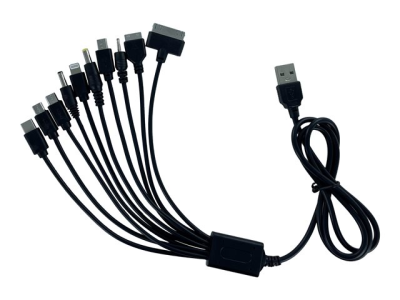 Câble de charge multi-connecteurs pour téléphones portables. Câble USB 26cm. 10 connecteurs. Compatible Apple, Nokia, LG, Sony Ericsson, Samsung, appareils micro USB, appareils mini USB.